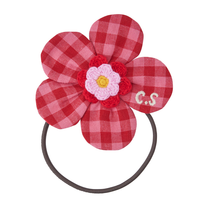 深みのあるピンク色と上品な赤を組み合わせたブランドの代表的なデザインの「チエコサクチェック」のお花のヘアゴムです。ヘアアクセサリーとしてはもちろん、ぬいぐるみやバッグにつけたり、ブレスレットなどとしても楽しんでいただけます。お洋服とコーディネートしやすいかわいいヘアアクセサリーです。