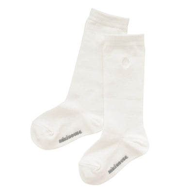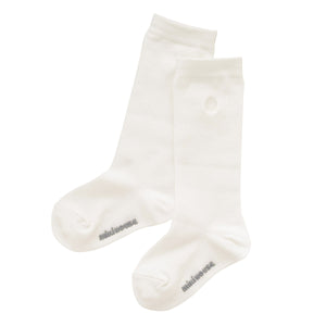 同色のロゴ刺しゅうが上品なハイソックスです。