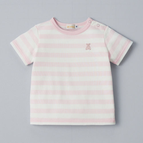 胸元にはラメ糸でワンポイントのベア刺繍を施しました。カジュアルなボーダー柄のデザインながら、上品な印象を与えてくれるカバーオールは、主役の赤ちゃんのかわいらしさを、さらに輝かせてくれます。