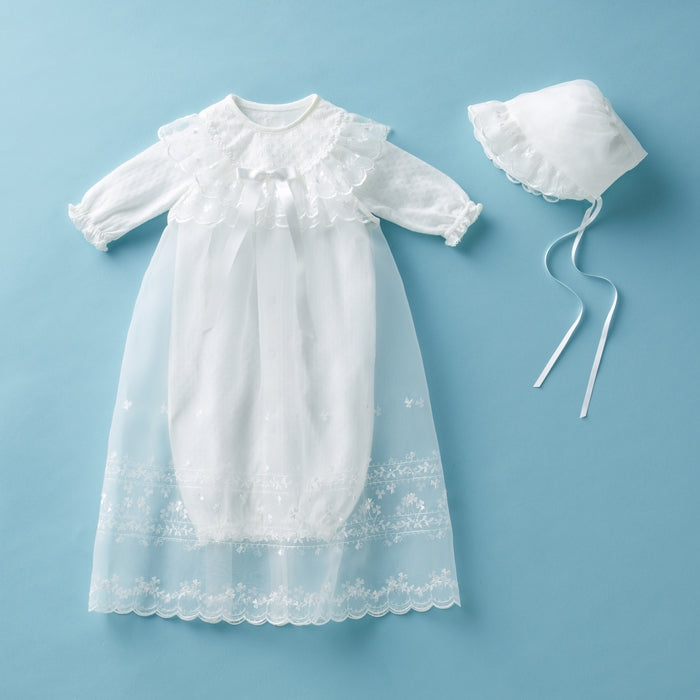 華やかなオーガンジーコートと、ツーウェイオール、セレモニー用フードの3点セットです。アフガンやスタイ、ソックスなどの小物と一緒にご準備いただくのもおすすめです。