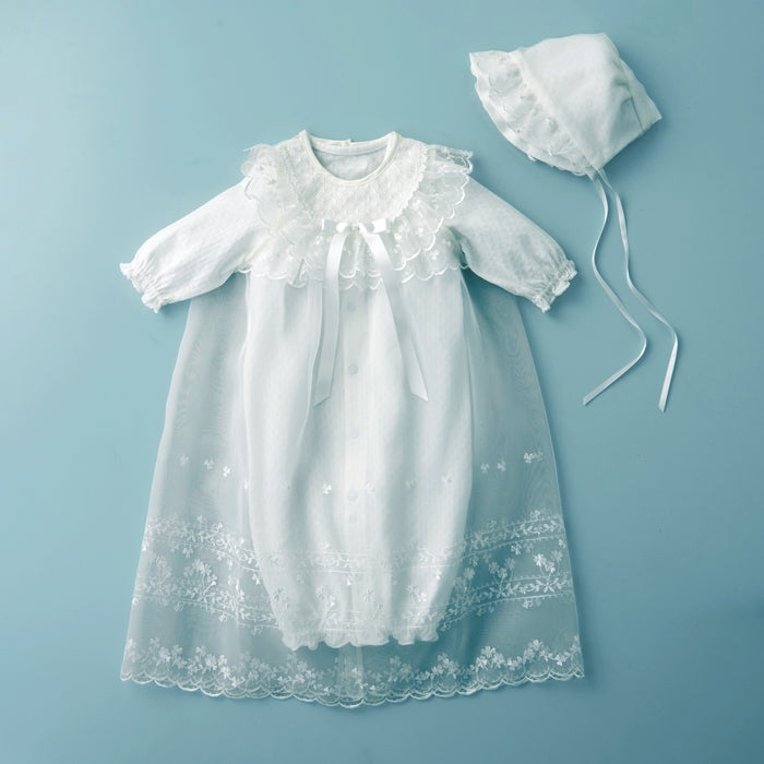 豪華なオーガンジーコートと、ツーウェイオール、セレモニー用フードの3点セットです。アフガンやスタイ、ソックスなどの小物と一緒にご準備いただくのもおすすめです。