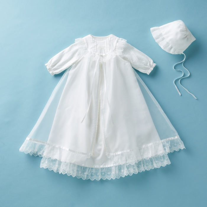 華やかなオーガンジーコート、ツーウェイオール、セレモニー用フードの3点セットです。アフガンやスタイ、ソックスなどの小物と一緒にご準備いただくのもおすすめです。