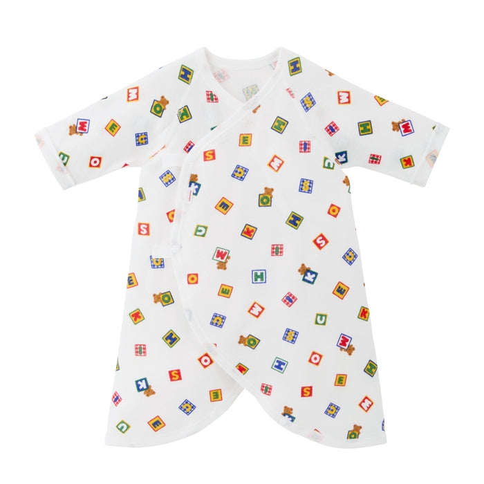二枚層でふんわりニットガーゼ素材のコンビ肌着です。マルチドットとブロックロゴのプリント柄です。お着替えをより簡単にできるホック仕様の新生児肌着。出産準備の基本アイテムです。
