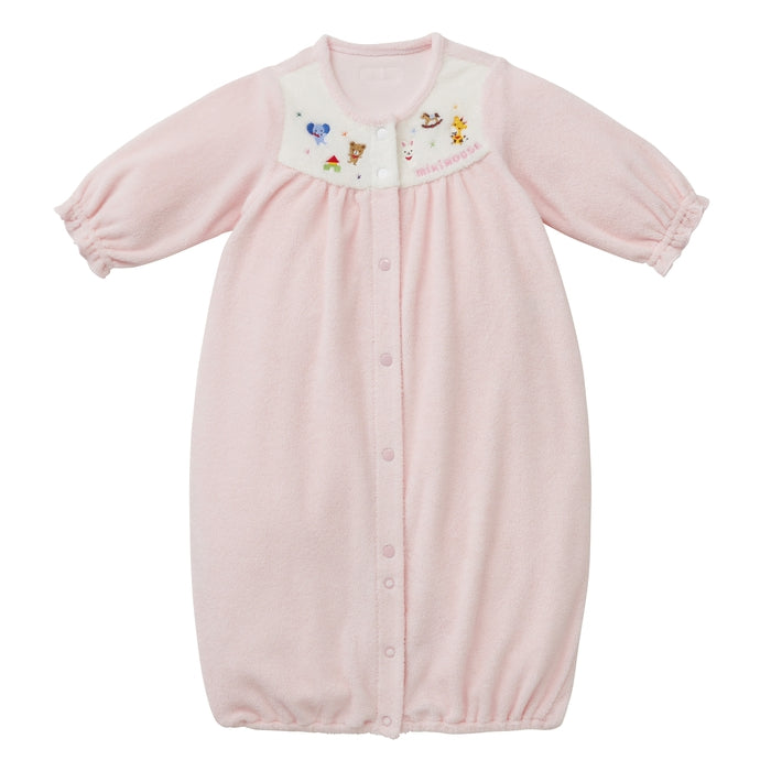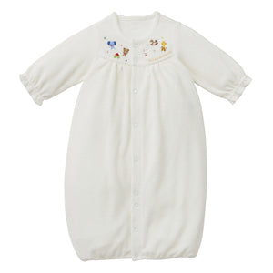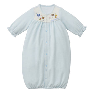 パイル素材のツーウェイオールです。胸元ヨーク部分のどうぶつ刺繍が上品でかわいいデザイン。出産準備や出産祝い、プレゼントに便利なベビーアイテムです。