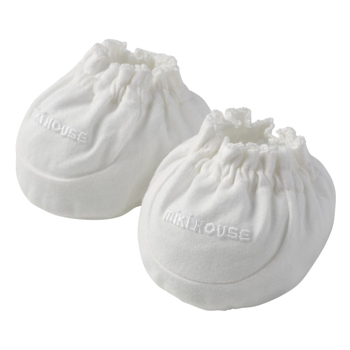 ロゴ刺繍がついた新生児用のブーティです。どのウエアにも合わせやすい無地は、お揃いのミトン・フードと一緒に出産準備や出産祝い、プレゼントに便利なベビーアイテムです。生まれてきた記念にもおすすめ。