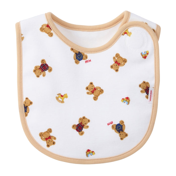 ミキハウスベア柄のスタイです。同柄の肌着や新生児小物などと合わせて、出産準備や出産お祝い、プレゼントに便利なベビーアイテムです。お出かけ用にもおすすめ。