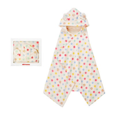 ドットとクマ柄のフード付きバスポンチョです。新生児から使え、出産祝い、プレゼントにおすすめです。