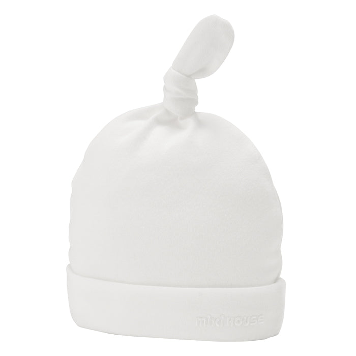 ロゴ刺繍がついた新生児用のベビーフード(帽子)です。まだやわらかいデリケートな赤ちゃんの頭の保護・保温のためにかぶせてあげましょう。同柄のミトン・ブーティと一緒に出産準備や出産祝い、プレゼントに便利なベビーアイテムです。