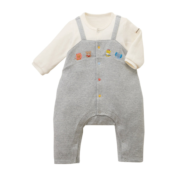 オーバーオールパンツをはいたようにみえるセパレート風カバーオール(長袖ロンパース)です。小さなかわいい動物たちがひょっこり顔を出した刺繍のベビー服です。