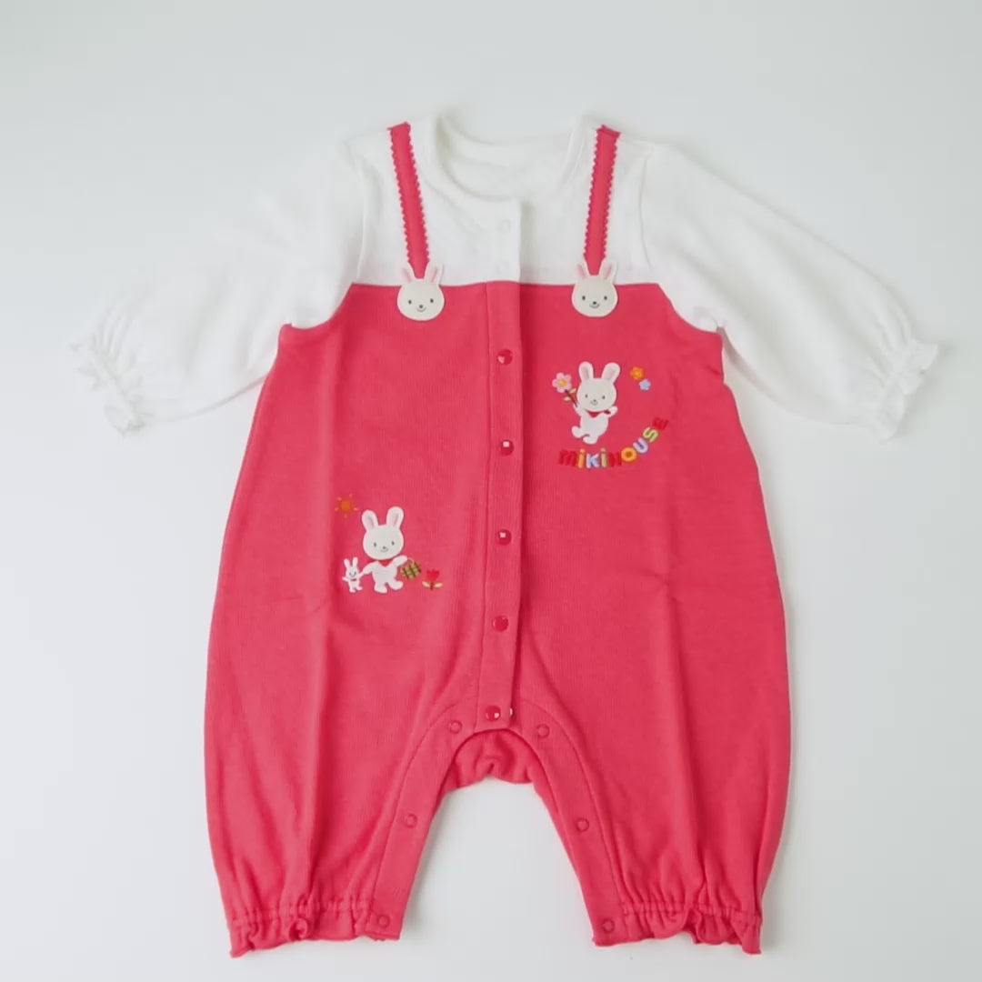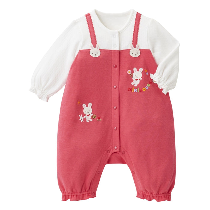 かわいいうさぎのモチーフがついたオーバーオール風のカバーオールです。ギャザーをよせて女の子らしいセパレート風に見えるカバーオールは人気のベビーアイテム。出産準備や出産お祝いにおすすめです。