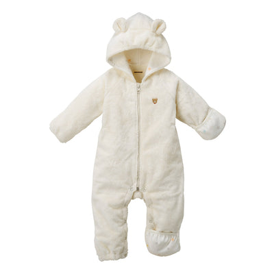 とても暖かいマイクロファー素材の防寒カバーオールです。心地よく着用でき、寒い時期のお出かけに便利なベビーアイテムです。