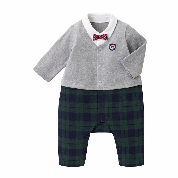 フォーマル風デザインのカバーオールです。蝶ネクタイがついて1着で、きちんと感のでるロンパースです。写真映えもするので、お呼ばれの機会やハーフバースデーなどの赤ちゃんの行事におすすめ。出産祝いやプレゼントにも喜ばれるアイテムです。