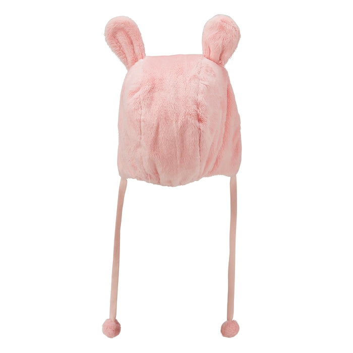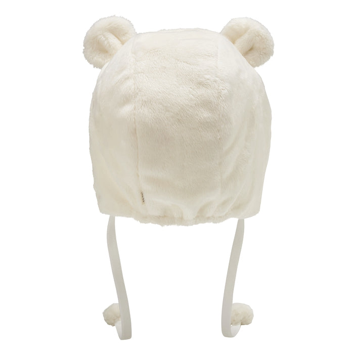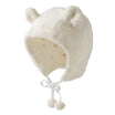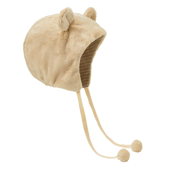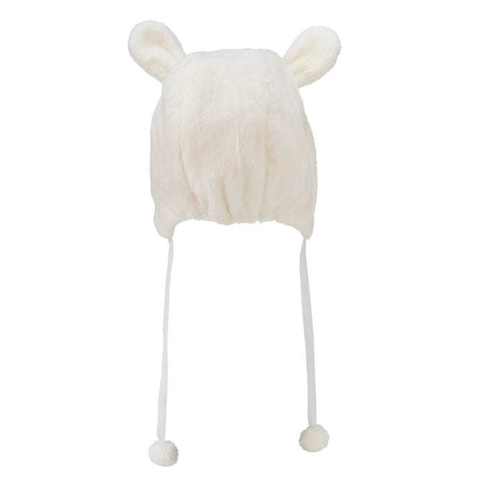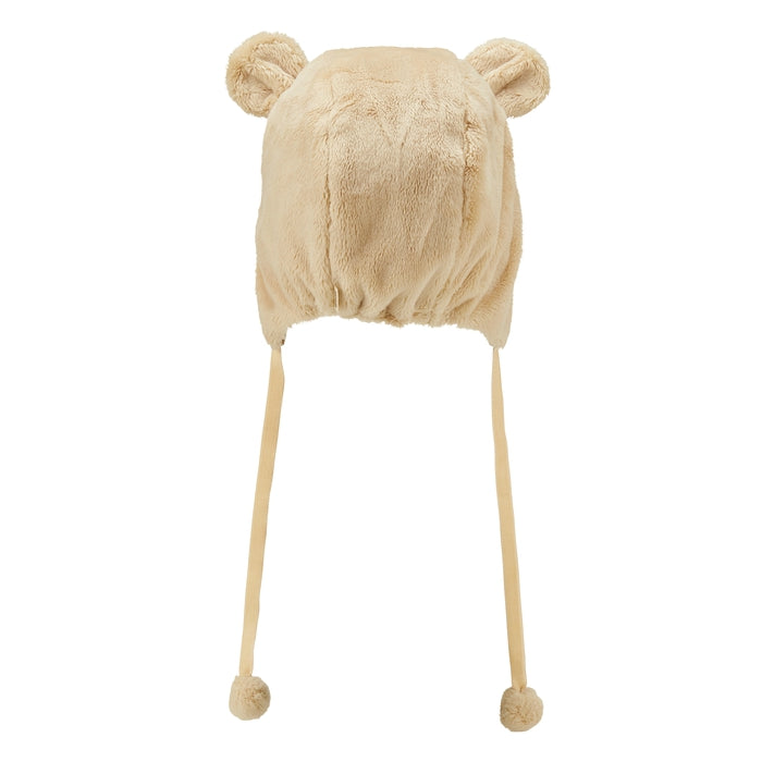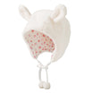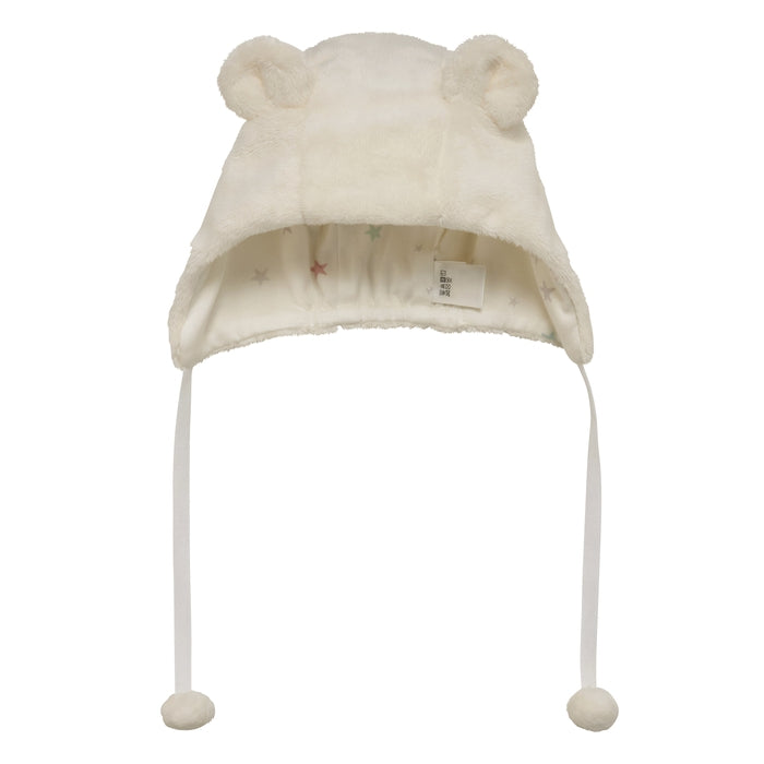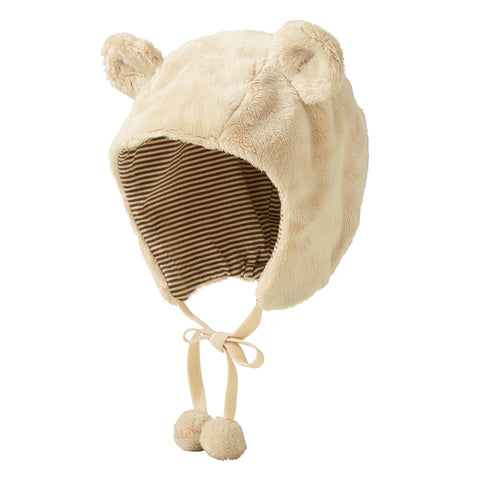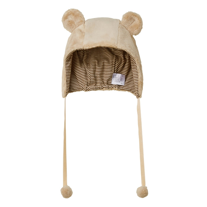 とても暖かいマイクロファー素材のベビーフードです。マイクロファー素材の防寒アイテムと一緒にプレゼントにおすすめです。ボンボン付きの紐を結ぶと愛らしい装いです。