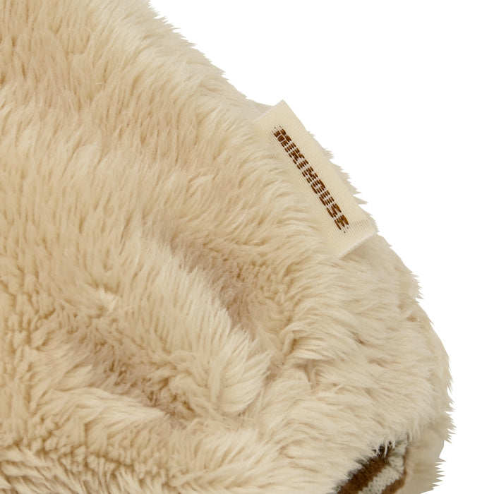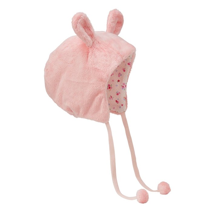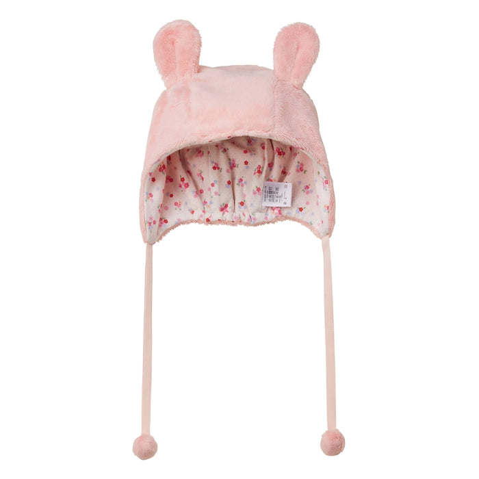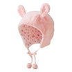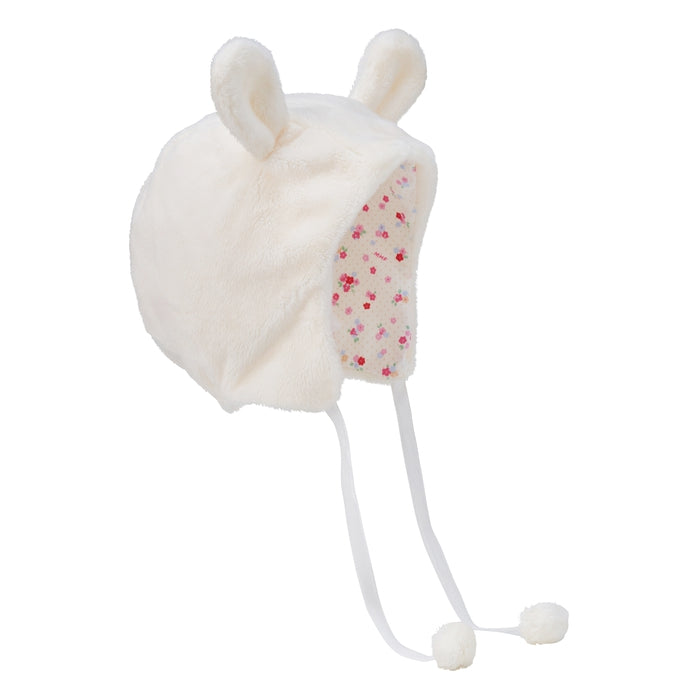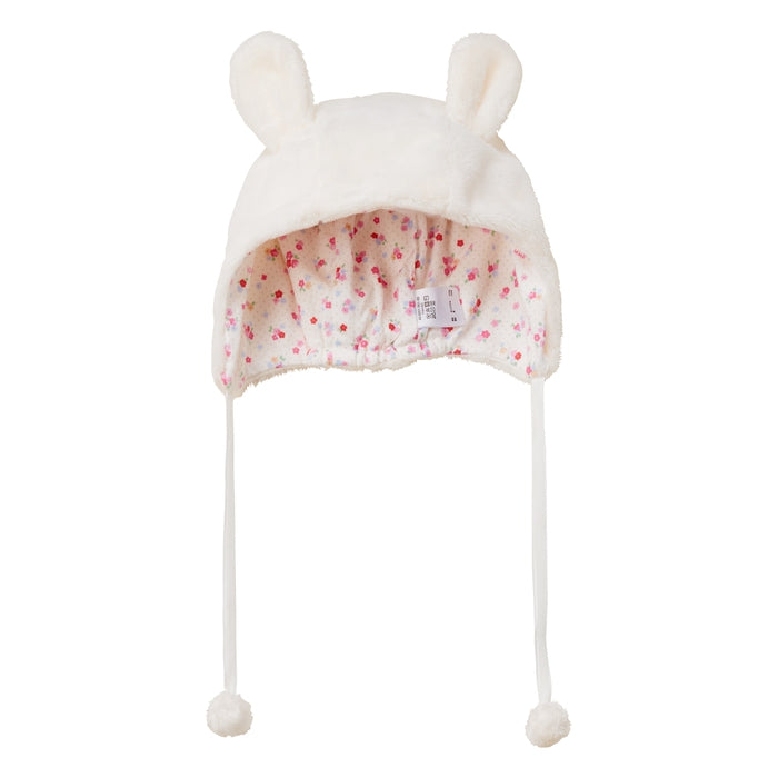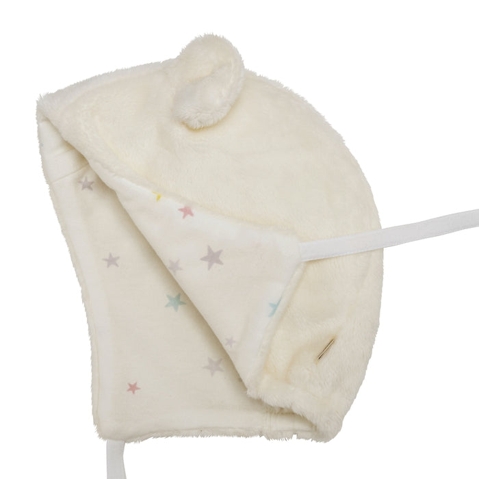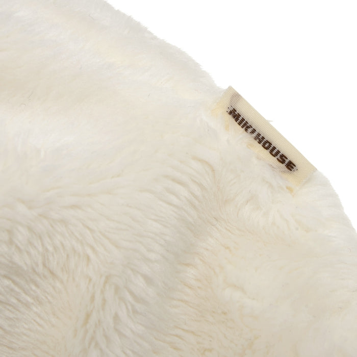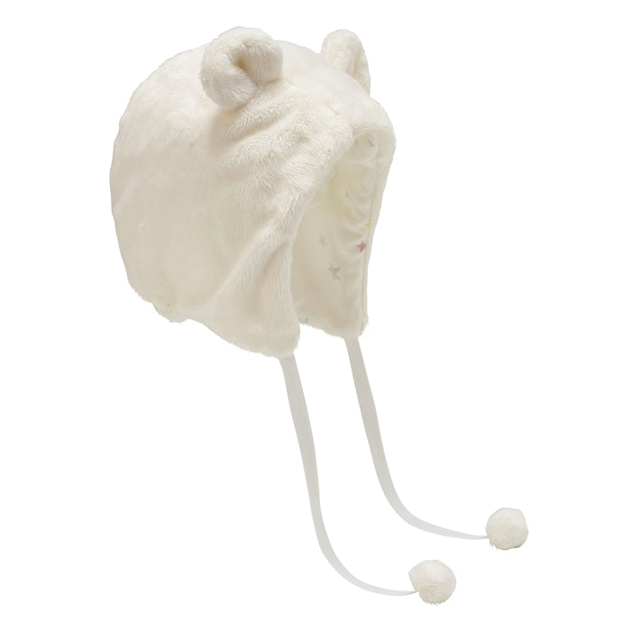 とても暖かいマイクロファー素材のベビーフードです。マイクロファー素材の防寒アイテムと一緒にプレゼントにおすすめです。ボンボン付きの紐を結ぶと愛らしい装いです。