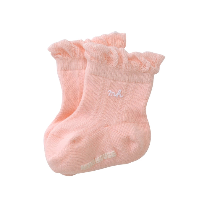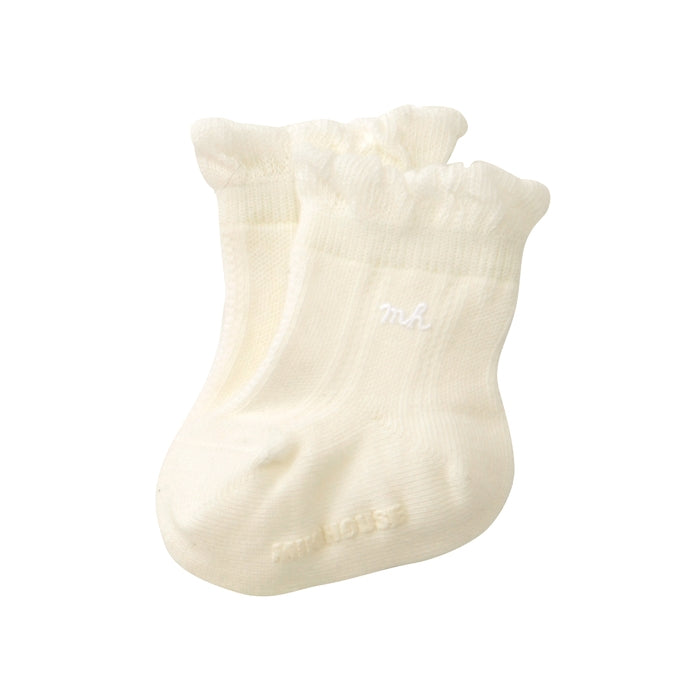 ・上品なレース編みで清楚、履き口の編みフリルもかわいい一足