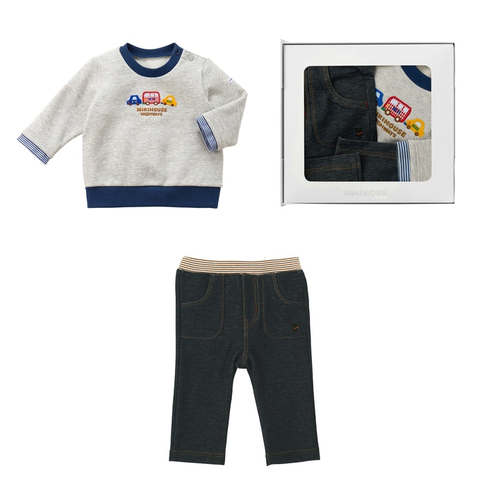 のりものの刺繍ワッペンが付いたトレーナーとパンツの2点ギフトセットです。出産お祝いやプレゼントにおすすめ。