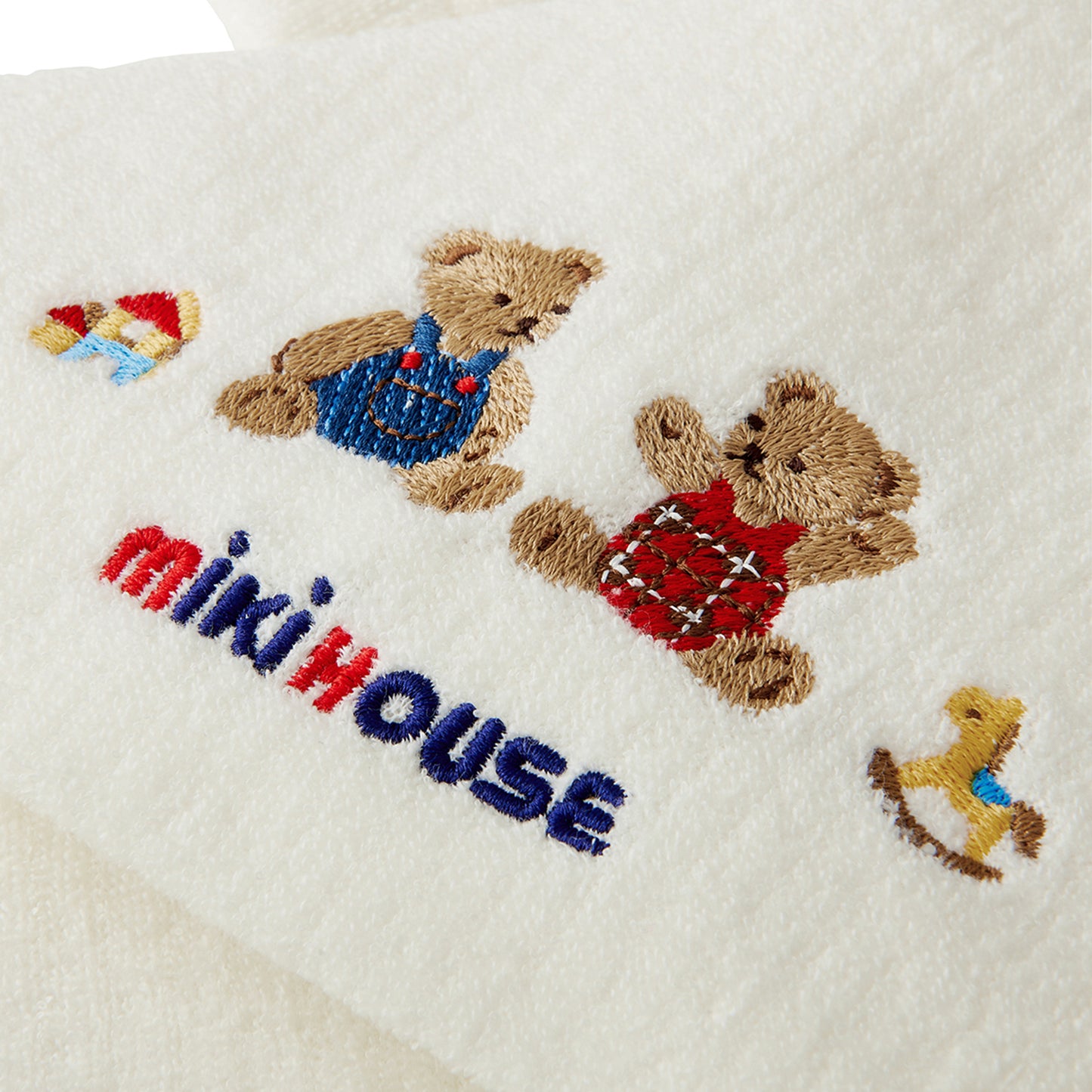 ミキハウスベアのかわいい刺繍をあしらったアフガンです。ご退院やお宮参りに適した一年を通してお使いいただける素材です。男女を問わず、お祝として喜ばれるアイテム。