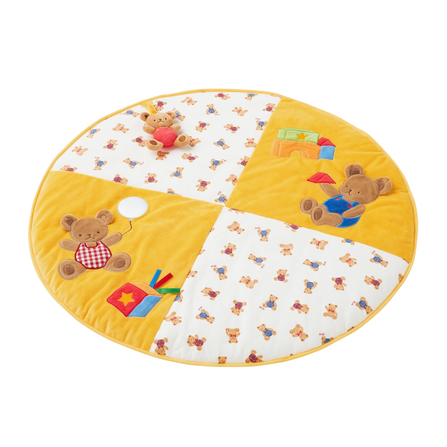 やわらかなパステルイエローとミキハウスベア柄のベビープレイマットです。出産祝いや贈り物、プレゼントとしておすすめのベビーグッズです。