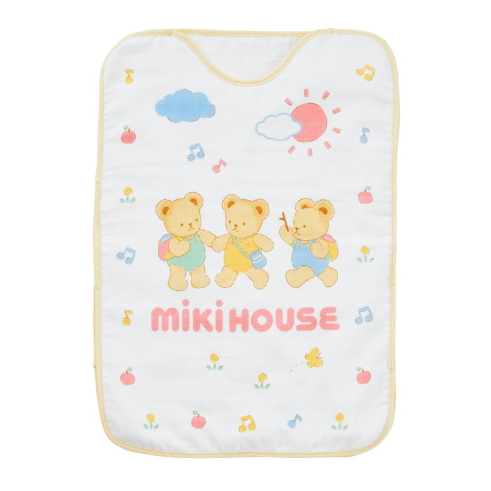 赤ちゃんの寝冷え対策や、お風呂あがりに便利なガーゼスリーパーです。かわいいミキハウスベア柄で、表裏の柄が異なる愛らしいデザイン。肩やお腹が冷えるのを防ぐベビーアイテムです。出産お祝いやプレゼントにおすすめ。