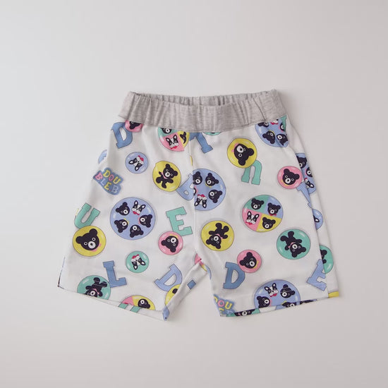 缶バッチ風デザインの5分丈パンツです。天竺素材ではきやすく、同柄シリーズでセットアップしたり、リンクコーデも楽しめるアイテムです。