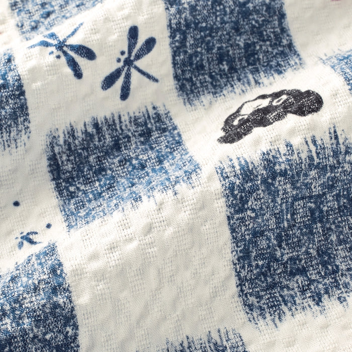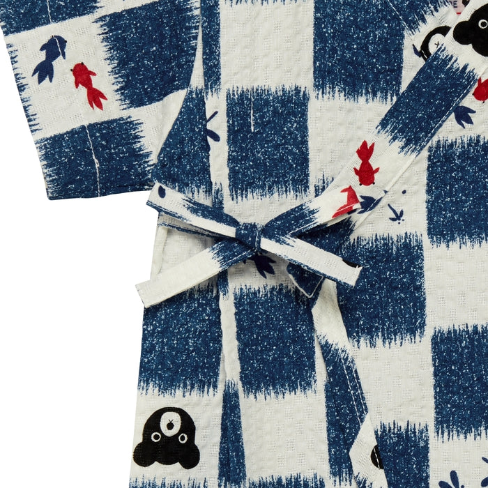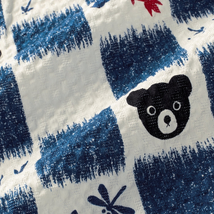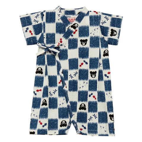 毎年人気の格子柄をベースに、黒クマ・金魚・トンボをデザインした甚平オールです。通気性に優れているので、夏のパジャマや部屋着としても人気のアイテムです。お洋服と同じ感覚で気軽に着まわせて、涼しいのが特長です。