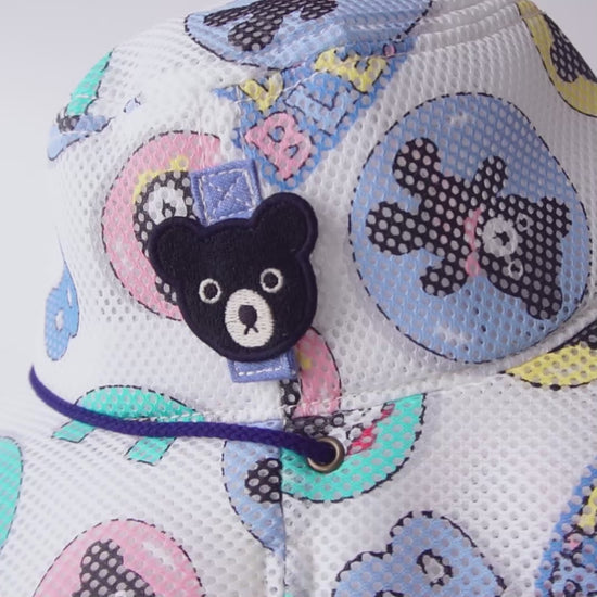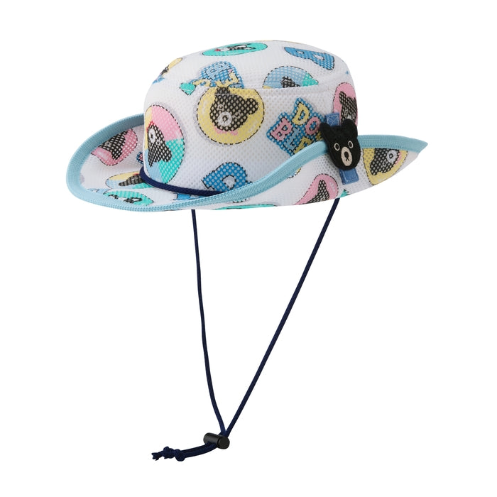 缶バッチ風デザインのテンガロンハット(帽子)です。春をイメージして、パステルカラーを基調とした色合いの帽子。長めのあごひもで、深めにかぶるとウエスタン風のデザイン。同柄のウエアとお揃いで楽しめるアイテムです。