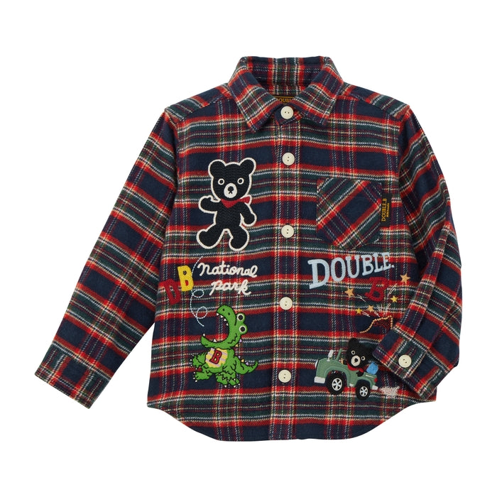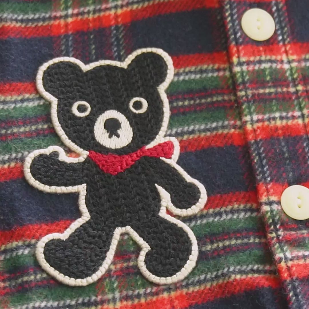 迫力のある恐竜と黒クマの豪華な刺繍が施されたネルシャツ(長袖)です。起毛されたシャツは、ツイードベストなどとのコーディネートがおすすめ。