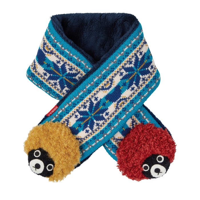 冬の定番ノルディック柄をベースに、クマの立体編みモチーフが付いたマフラーです。ウールのやわらかくて暖かい本来の良さは損なわず、アクリルを混紡したオリジナルの素材。寒い冬におすすめです。