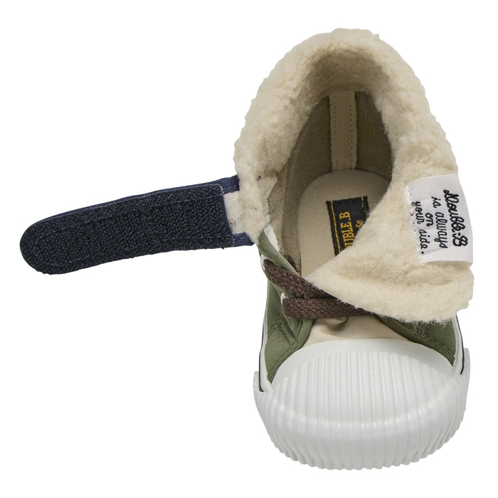 はき口に暖かな素材をあしらったアウトドアテイストのセカンドベビーシューズです。マウンテンパーカーなどにも使われている撥水加工を施した素材を使用し、ハイカットに仕上げたシューズです。