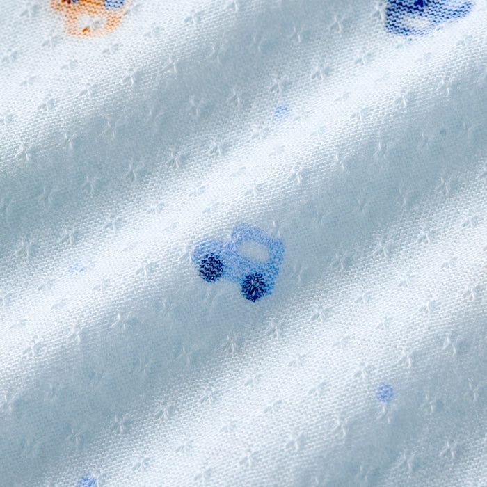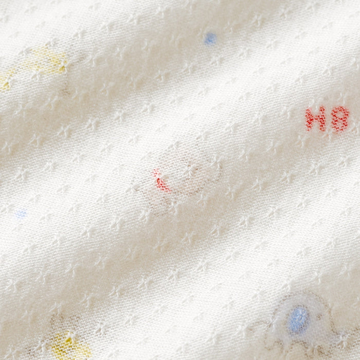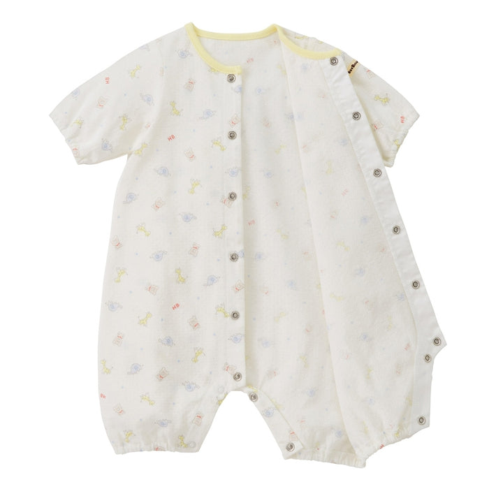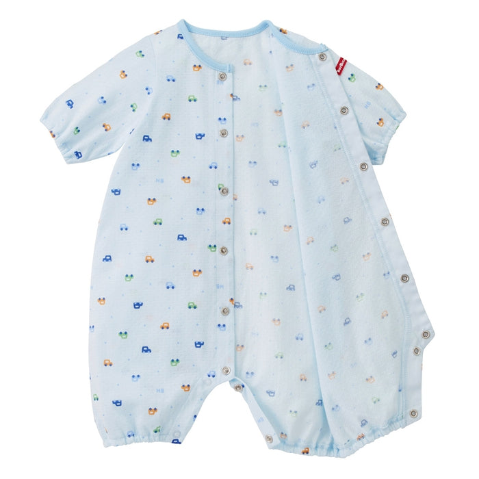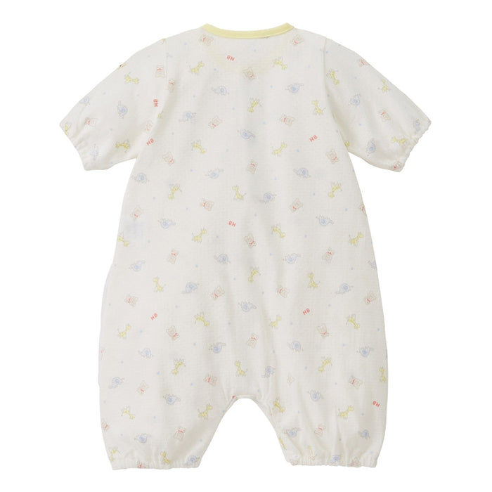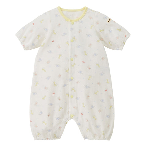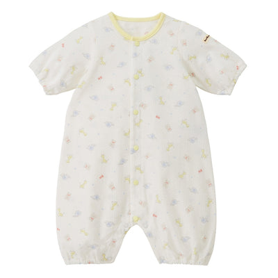 総柄プリントのプレオールです。ツーウェイオールより袖丈・着丈が短めで、生まれてすぐからフィット感よくご着用できる新生児ウエアです。出産準備や出産祝い、プレゼントに便利なアイテムです。