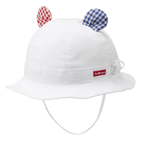 ギンガムチェックの立体的なくまみみが、お子さまのかわいさを引き立ててくれるデザイン。