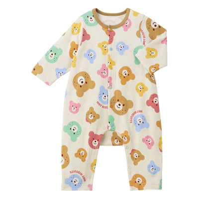 いろいろな色のビーンズが総柄となった、ポップなデザインのカバーオールです。