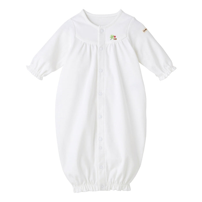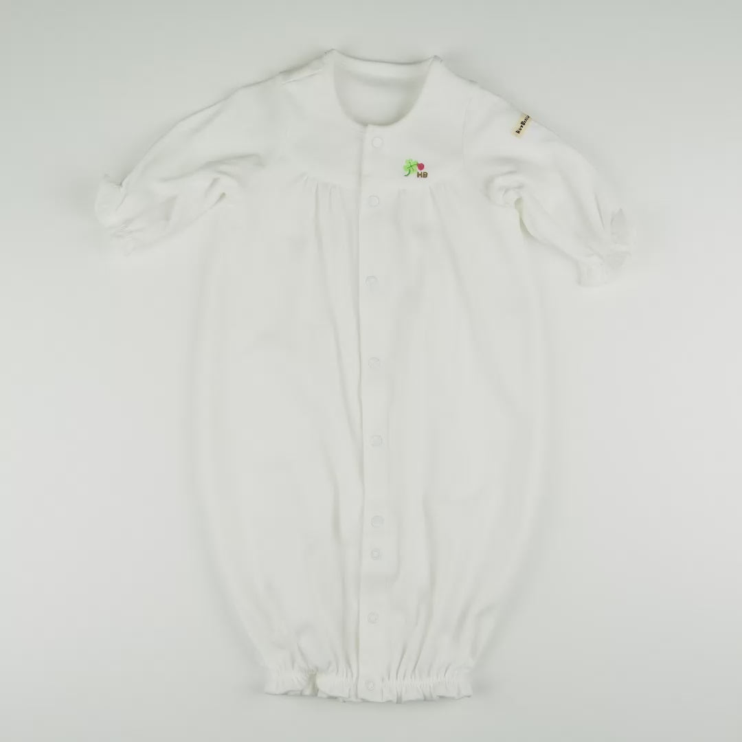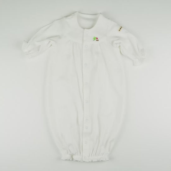 新生児期はおむつ替えに便利なドレスタイプに、足の動きが活発になってきたら、カバーオールタイプとして着用いただけます。