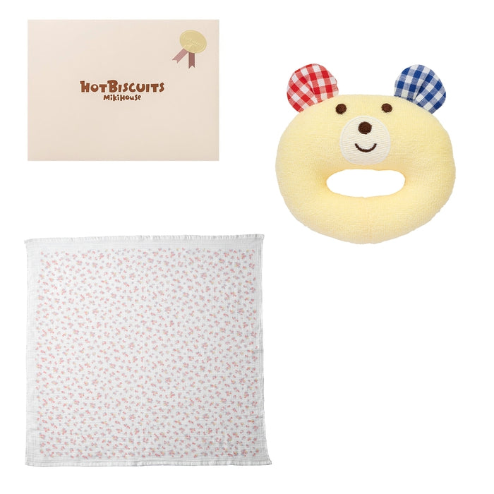 かわいいガーゼバスタオルとビーンズのラトルとのセットです。