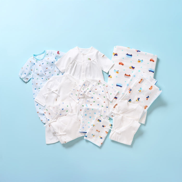 新生児肌着6枚(短肌着3枚、コンビ肌着3枚)、プレオール2枚、ガーゼハンカチ2枚、ガーゼタオル2枚、ガーゼバスタオル1枚 の計13点のセット。