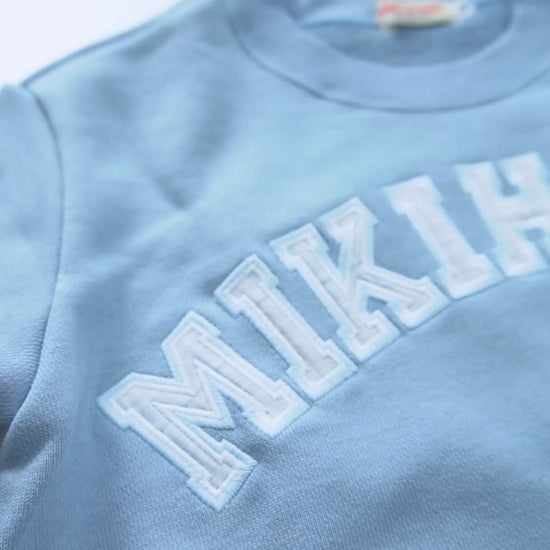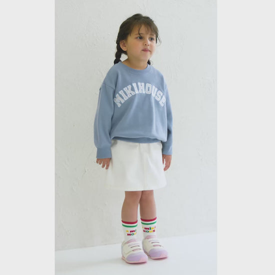 大学のスウェットを思わせるフォントにミキハウスチェックを合わせ、カジュアルながらもおしゃれに着ていただけます。