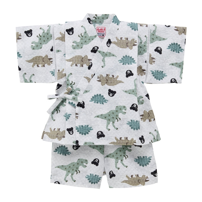 お子さまが大好きな恐竜を和柄で仕上げた甚平スーツです。麻の葉柄もプリントされた縁起ものデザイン。渋い色目や色ブレにこだわり仕上げた『THE!JAPAN』シリーズの甚平です。通気性に優れているので、夏のパジャマや部屋着としても人気のアイテムです。お洋服と同じ感覚で気軽に着まわせて、涼しいのが特長です。