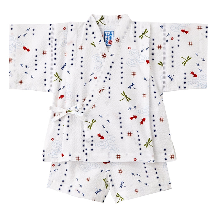 凉爽地游泳金色和蜻蜓花纹的甚平西装。