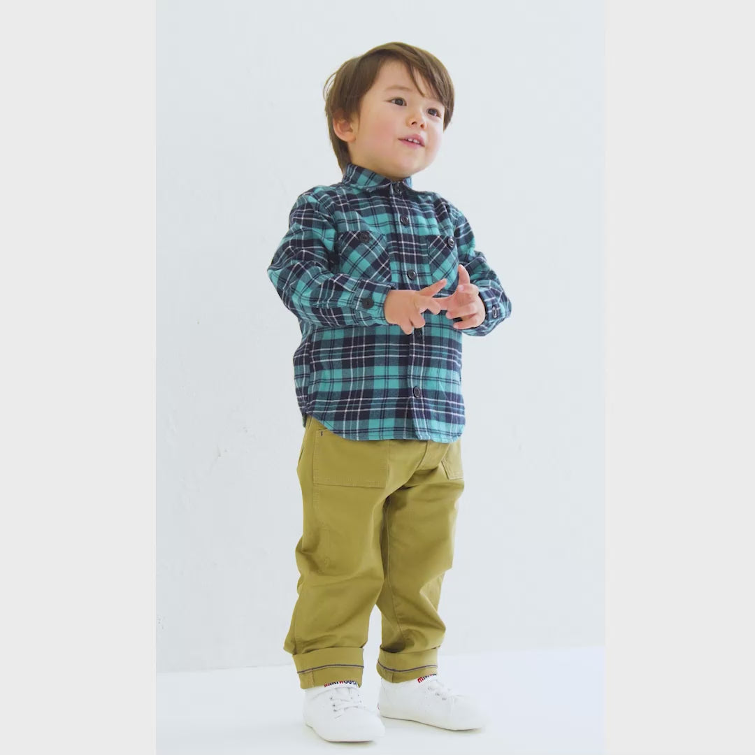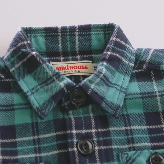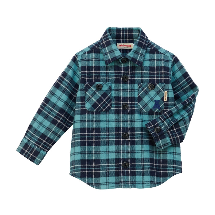 品の良い起毛ツイルのチェック生地をベースに、大きめのネコ目ボタンと角落としのパッチポケットでおしゃれに仕上げています。