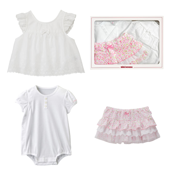 是附有很多可爱的薄纱花边的婴儿用裙子。 可以立即搭配紧身衬衫和t恤等上衣使用,非常方便。