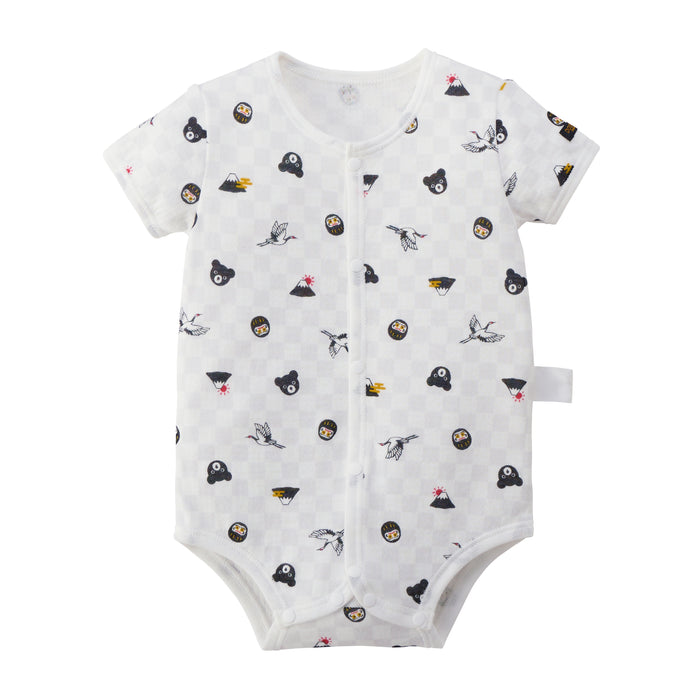 二枚層でふんわりニットガーゼ素材の半袖ボディシャツです。鶴とダルマと富士山の市松模様と、黒クマのオリジナル総柄のプリント柄。インナーとして使えるボディシャツは、短肌着・コンビ肌着を卒業したら便利な肌着です。